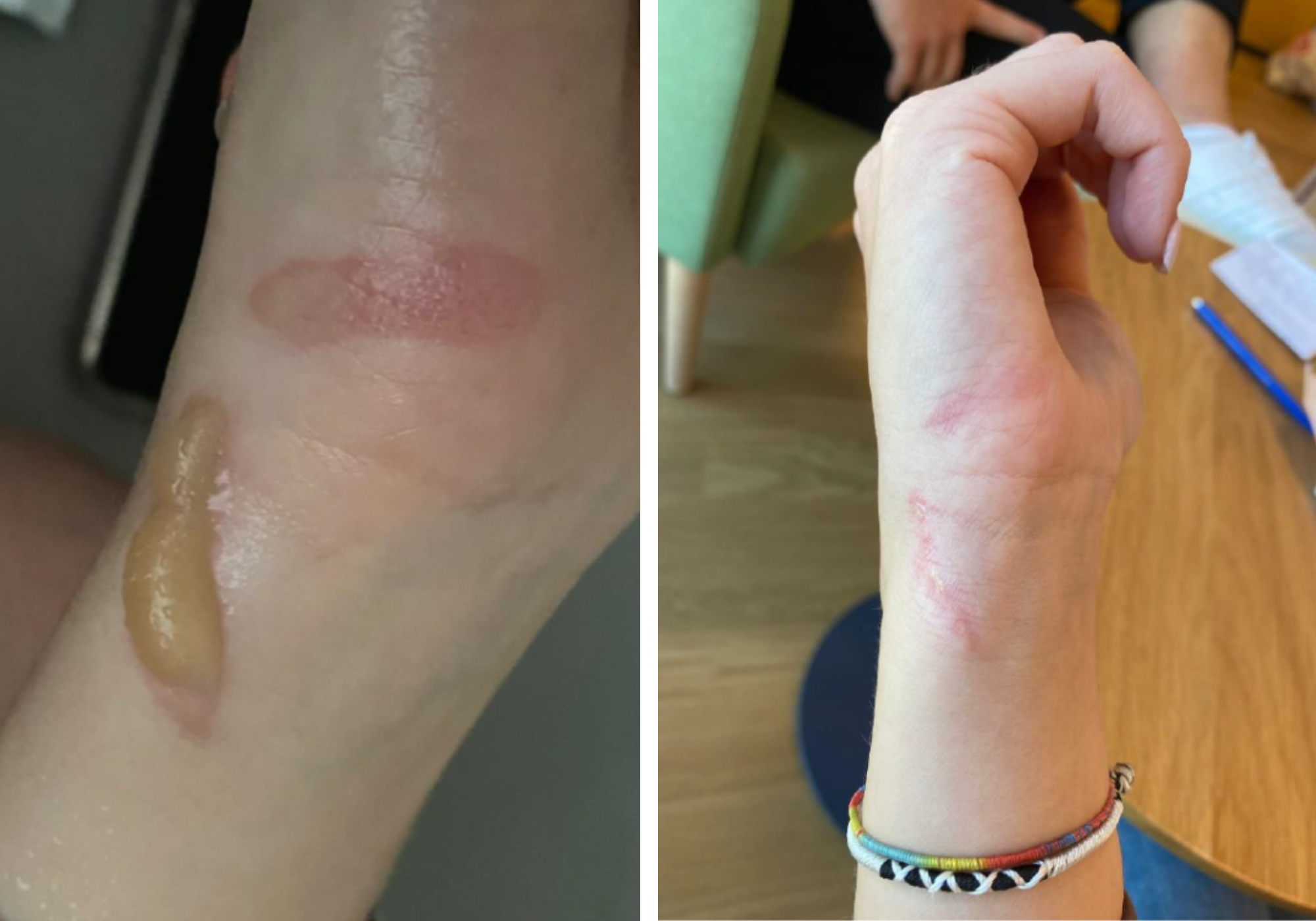 Vorher: Eine Verbrennung am Handgelenk, die sich an einer sehr unangenehmen Stelle befindet, reißt teilweise auf und wird ständig beansprucht.